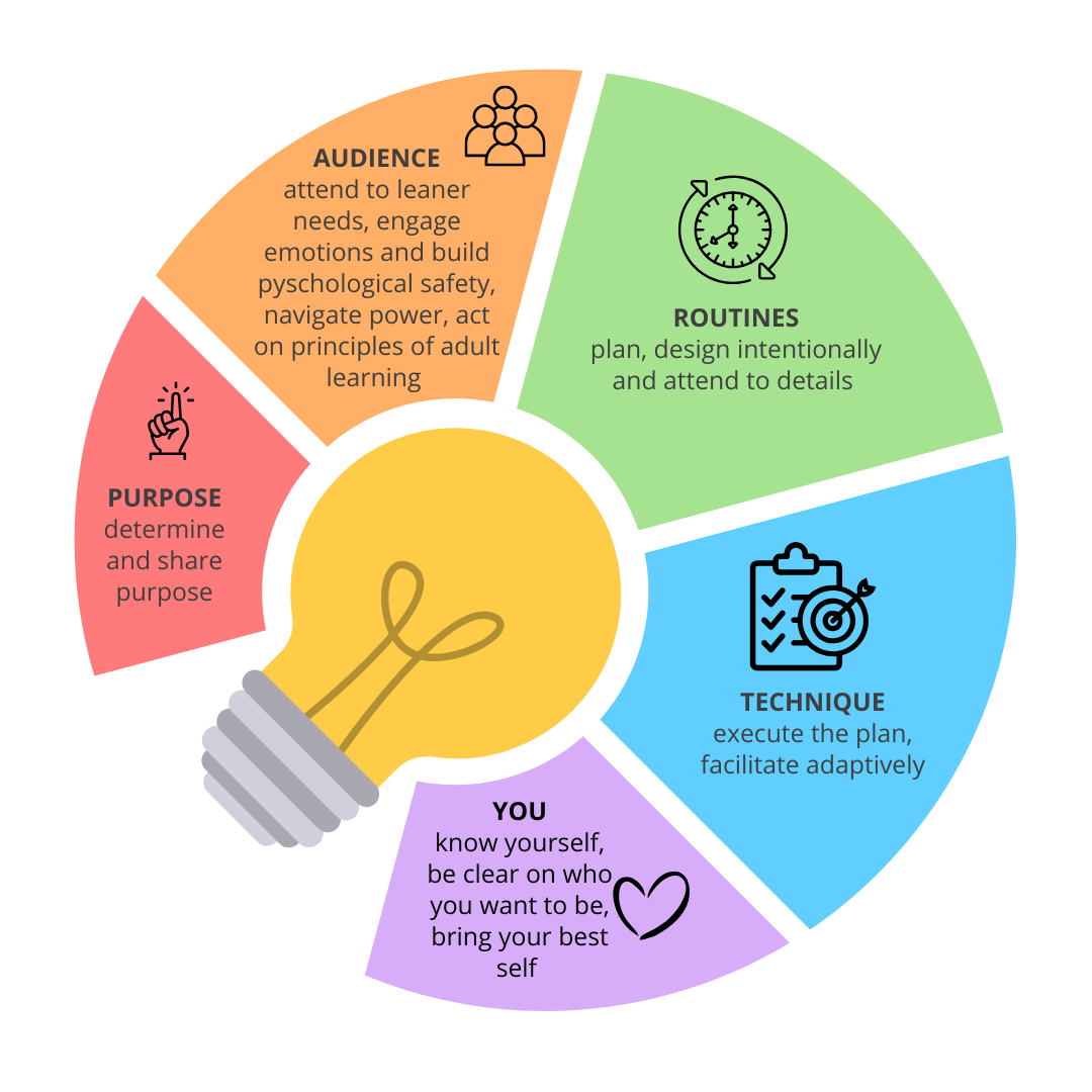 - Audience – attend to learner needs, engage in emotions and build psychological safety, navigate power, act on principals of adult learning