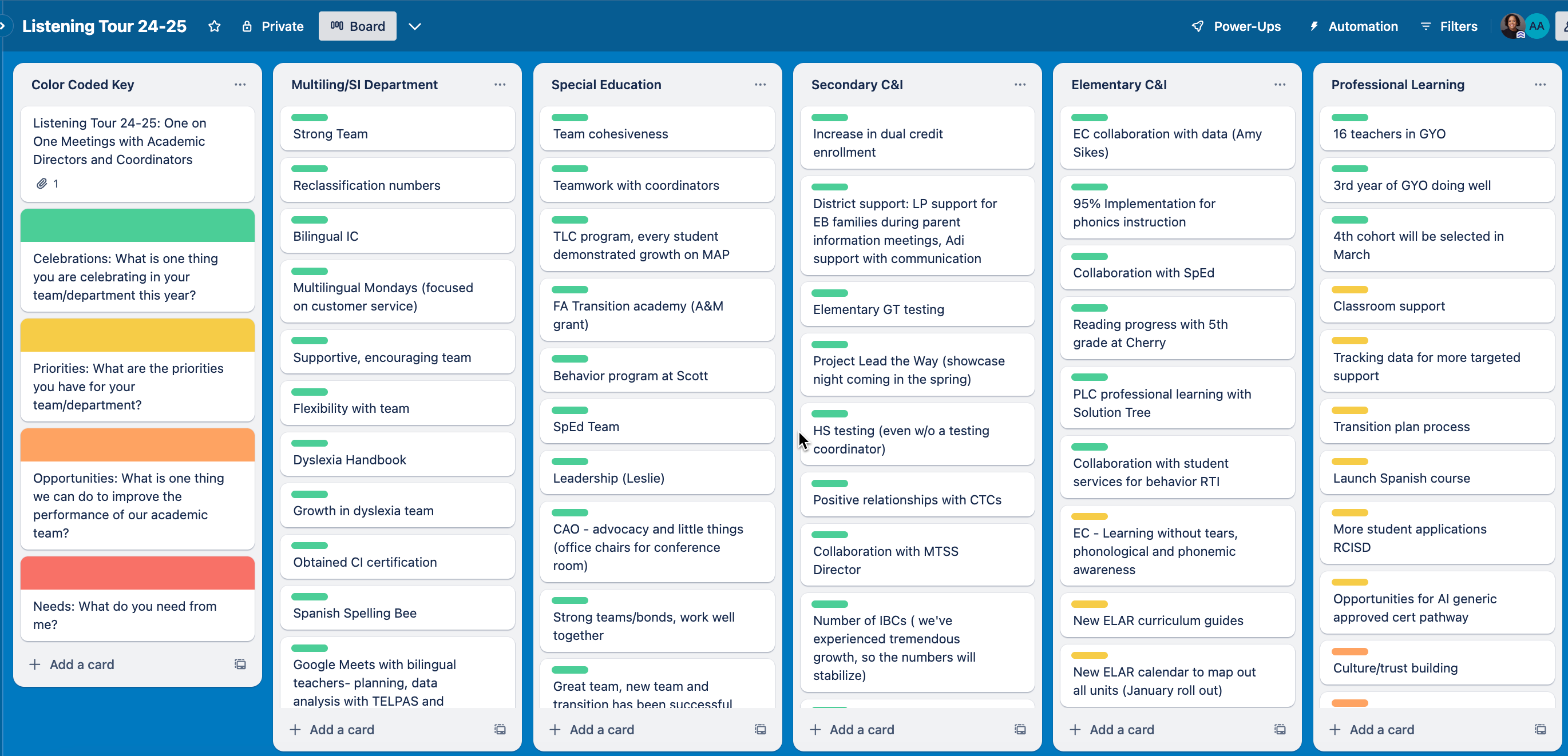 - Data Collection & Analysis: After each meeting, I organized my notes in a Trello board. My team organized in five major departments: (1) Multilingual/School Improvement/Federal Programs, (2) Special Education, (3) Secondary C&I, (4) Elementary C&I, (5) Professional Learning. I organized by group and color coded key themes in their responses. I’ve included a screenshot with three groups listed below.