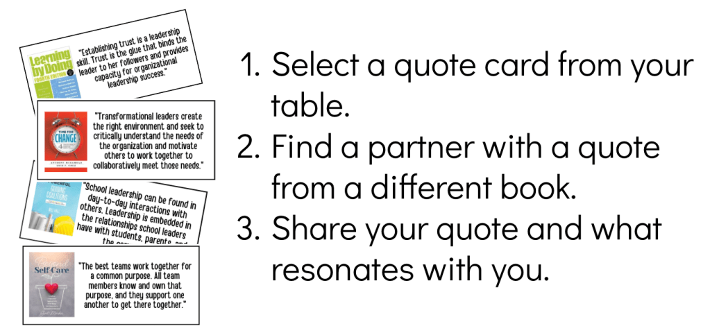 There are so many great resources for leadership development. One idea for previewing resources is to create quote cards and integrate them into professional development. Here is quick and simple activity. The books selected for this activity are listed below with links to the publisher. You can also download the quote cards for these titles below.